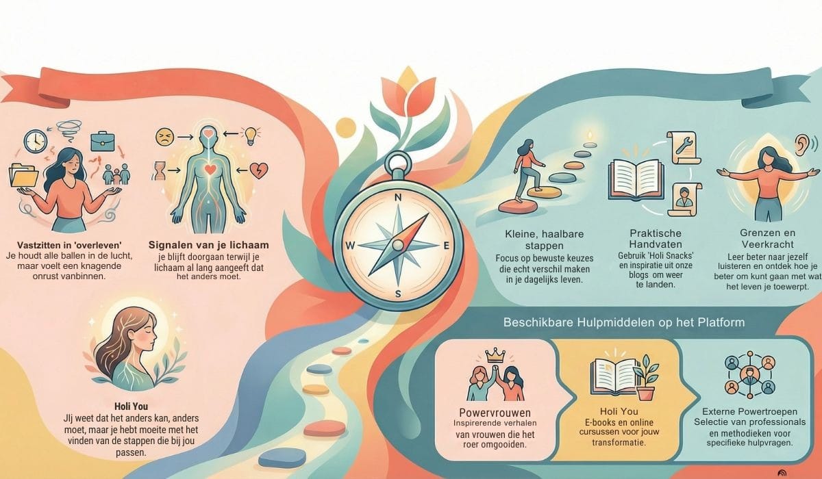 Hier vind je verhalen, inzichten en praktische tools en Holi Snacks (kleine wijze ebookjes) die je helpen met vertrouwen en daadkracht vooruit te kijken naar een nieuw hoofdstuk. Een hoofdstuk dat volledig past bij wie je nú bent, met bewuste keuzes en kleine stappen die écht verschil maken in je dagelijks leven.